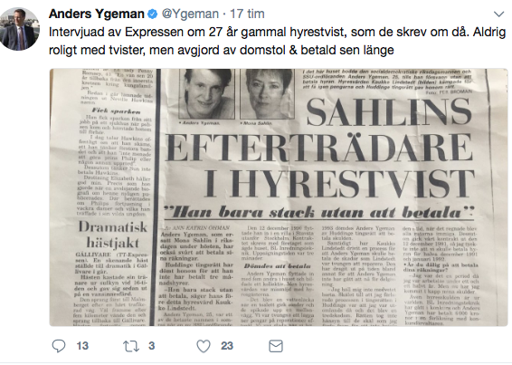 Ja herregud det trodde jag inte om Anders Ygeman att han skulle visa sig ha varit en riktig skurk i sin ungdom. Historien förtäljer att han som 21-åring tillsammans med ett kollektiv förstörde en villa på 90-talet och att han blev skyldig att betala pengar till de tre snickare, som ägde villan men aldrig betalade till dem. Så skamligt!