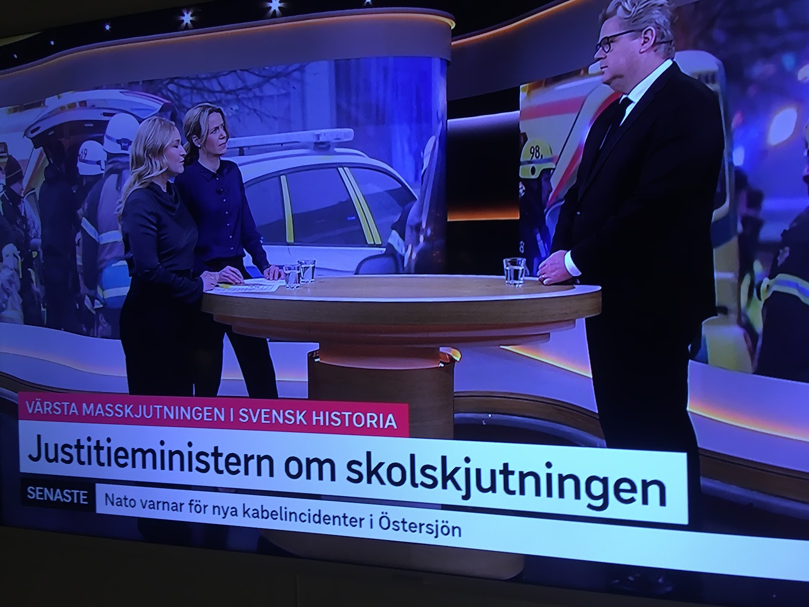 Justitieministern hade inte mycket nytt att komma med. Han hade en svag, tyst och ledsen röst. Det blev mycket spekulation i SVT fast han själv menade att det helst inte skulle förekomma. Men skolorna måste införa säkerhetsåtgärder, menade han. Som i USA.